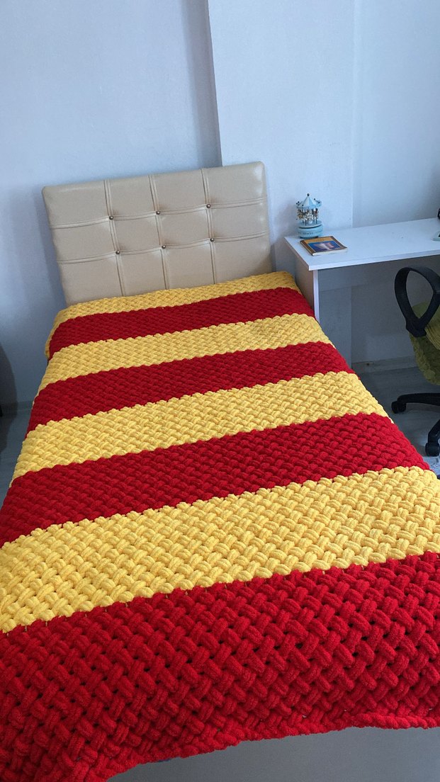 Kalın kırmızı ve sarı çizgili örgüden yapılmış renkli battaniye, yatağınıza sıcaklık ve doku katıyor. ️
