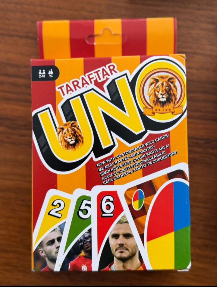 Taraftar temalı UNO kart oyunu, özel joker kartlar ve canlı oyuncu görselleri içerir. 2-10 oyuncu için uygundur.