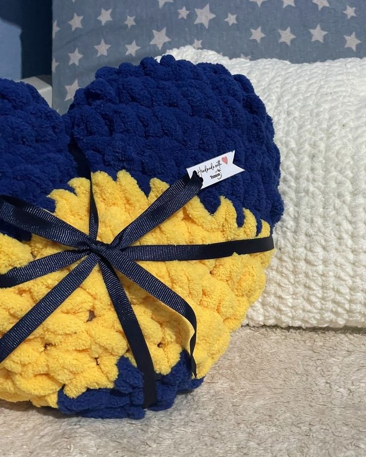 Sarı ve lacivert nakışlı, dokulu ve yumuşak tasarımlı renkli yastık, PUFFY İP İLE YAPILIR EL EMEĞİDİR. İstediğiniz renk ve ölçü ile yapılır