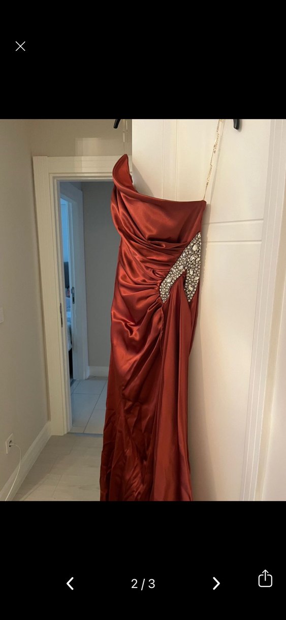 Bordo renkli, drapeli ve parlak kumaşlı uzun abiye elbise. Straplez yaka, ince askılı ve taş detaylı, düğünler için uygun.