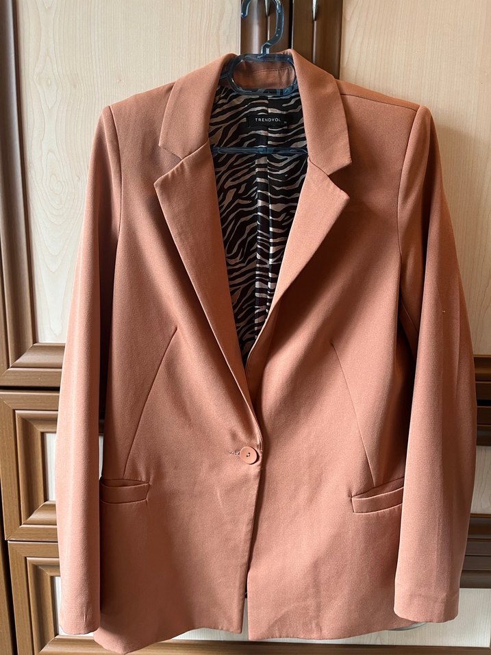 Tarçın renkli, düğmeli, çıt yakalı kadın blazer ceket. Regular kesim, uzun kollu ve parlak yüzeye sahiptir. İç astarı zebra desenlidir.