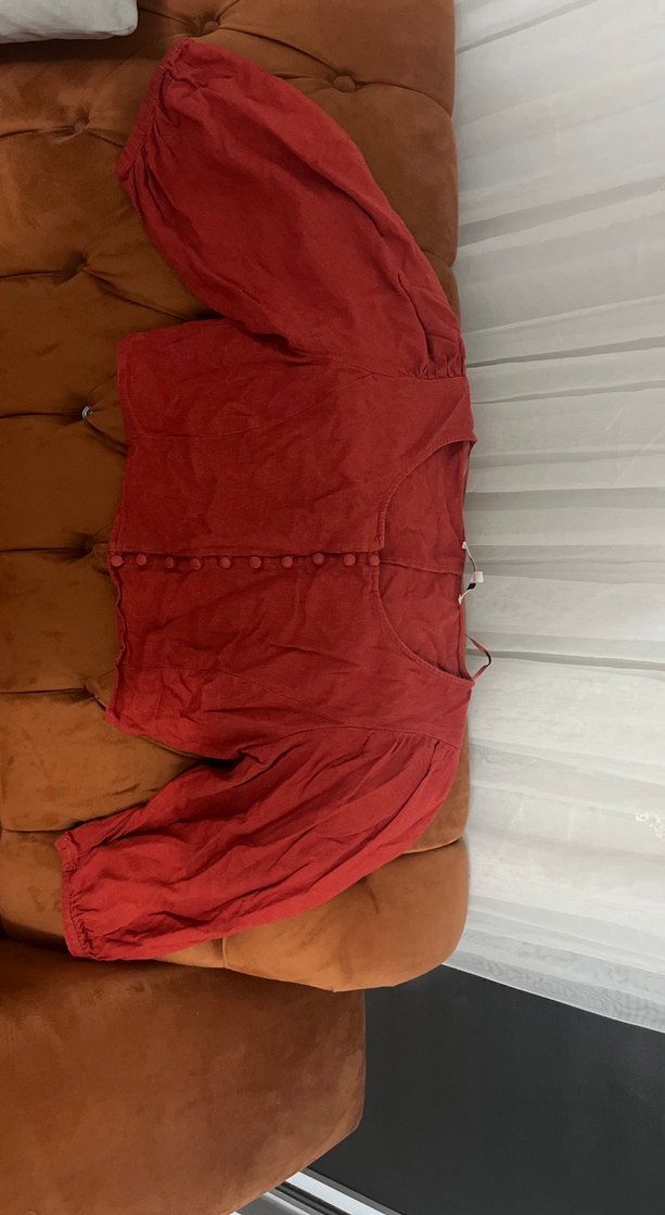 Koyu tarçın renkte, keten kumaştan, uzun kollu, geniş yakalı ve düğmeli bohem tarzda rahat kesim bluz. Günlük kullanıma uygundur.