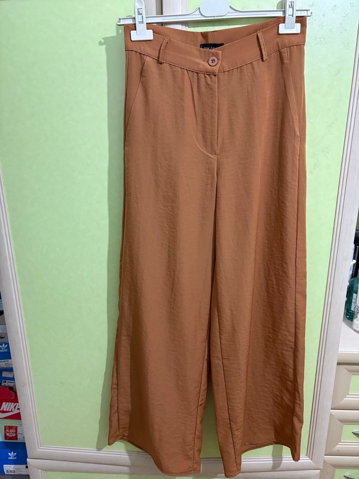 Kahverengi, midi boy, regular kesim kadın kumaş pantolon. Düz desensiz, ipeksi kumaştan günlük sokak stiline uygun rahat bir seçim.