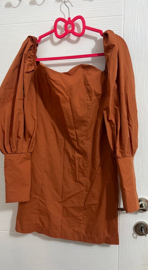 Tarçın rengi , kalp şeklinde göğüs kısmı kolları balon mini elbise