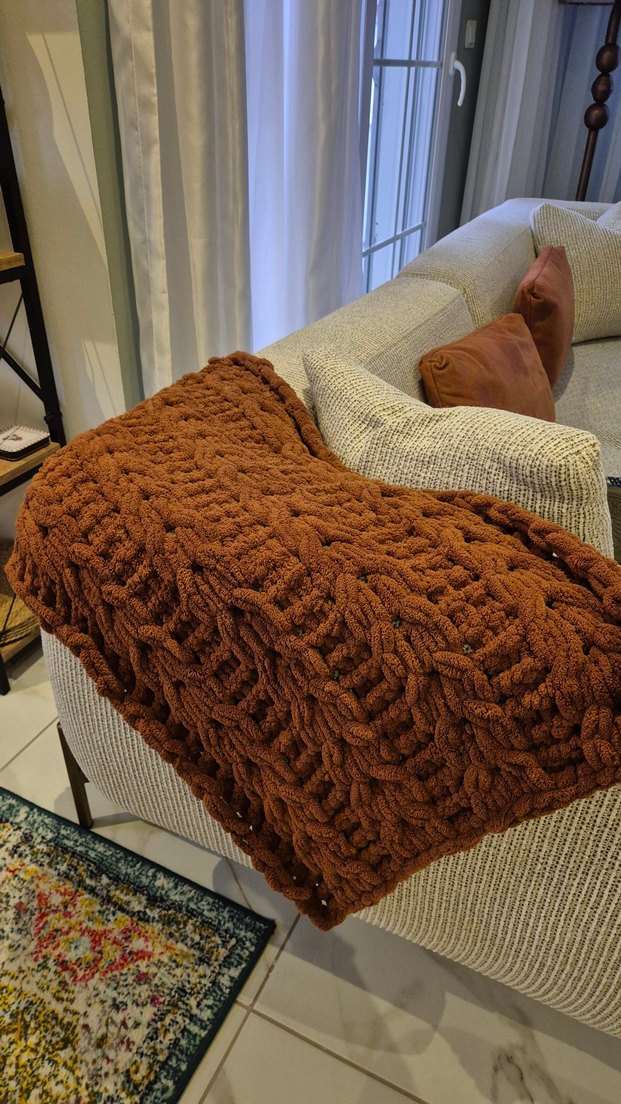 Koyu kahverengi, örgü yapıda, desensiz çocuk battaniyesi, yumuşak ve konforlu dokusuyla sıcaklık sağlar.