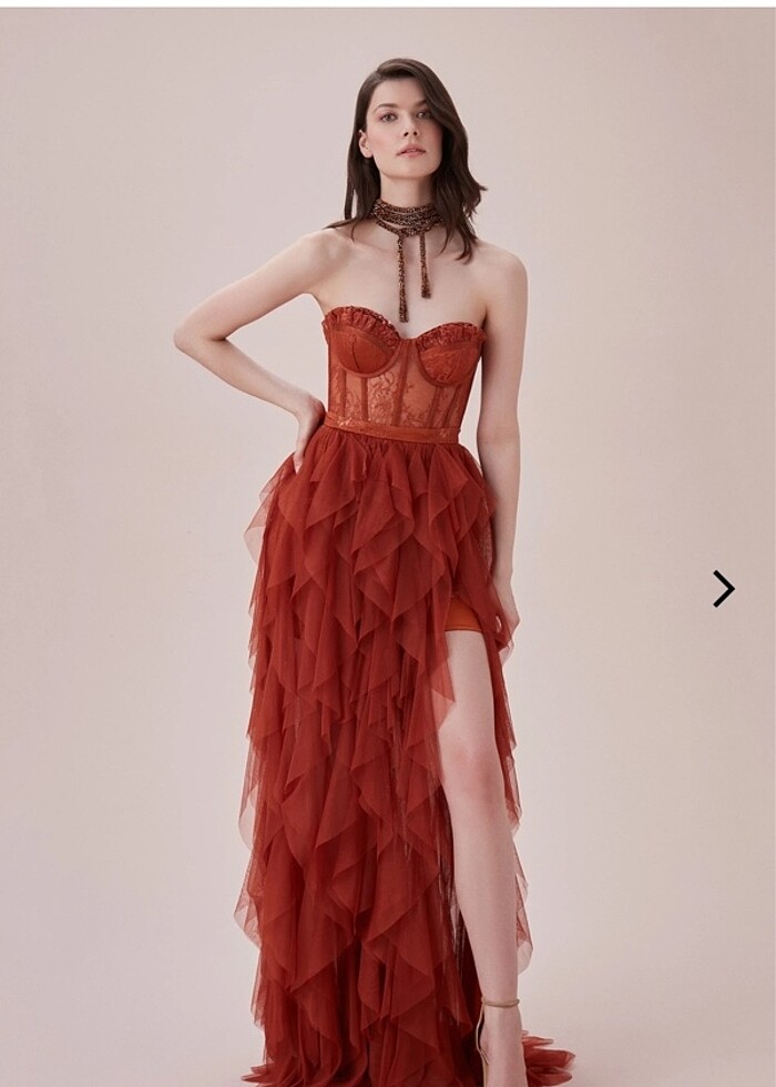 Tarçın Rengi Straplez Tül Alfabeta Abiye Elbise
