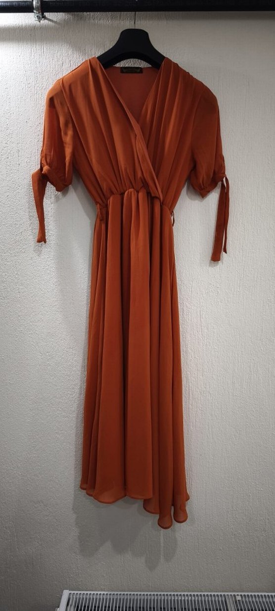 Uzun tarçın rengi elbise, parlak saten kumaş ve drapeli tasarıma sahiptir. V yakalı ve şifon uzun kolludur. Rahat kesimiyle modern bir stil sunar.
