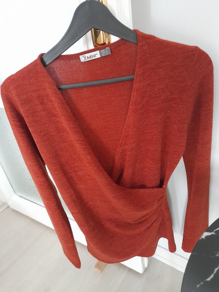 tarçın renkte, yumuşak yün kumaştan örülmüş, V yakalı ve uzun kollu, vücuda oturan kadın kazak. Rahat ve sıcak bir his verir.