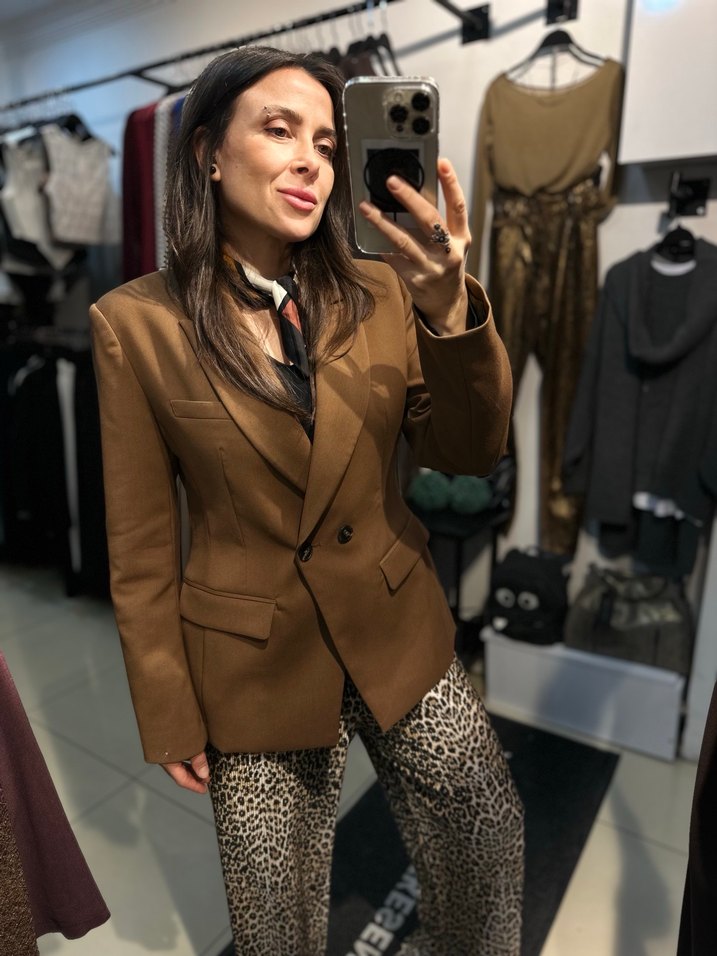 Tarçın renk belden oturtmalılı blazer ceket, düğmeli ve kesik yaka detayına sahip. Uzun kollu ve normal kesim, ofis için uygun. Marka Lefties. Zara değil.