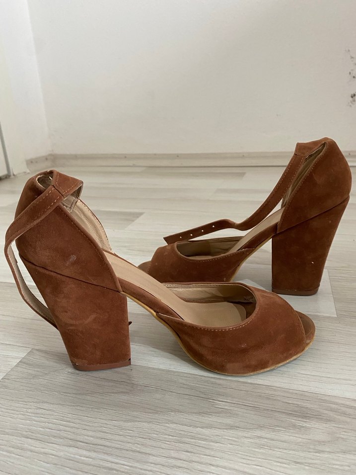 Tarçın süet kadının topuklu ayakkabısı, kalın topuklu ve tokalı, bohem tarzında. 2-3 kez giydim. İyi durumda. Çok rahat