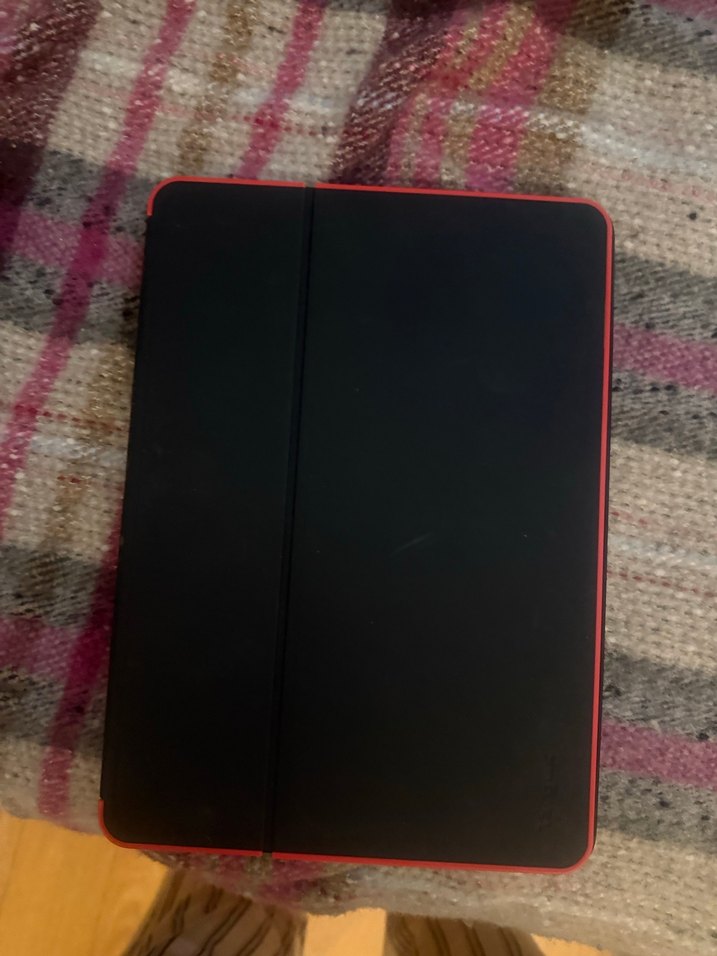 Cihazı korumak için tasarlanmış siyah ve kırmızı kenarlı tablet kılıfı.