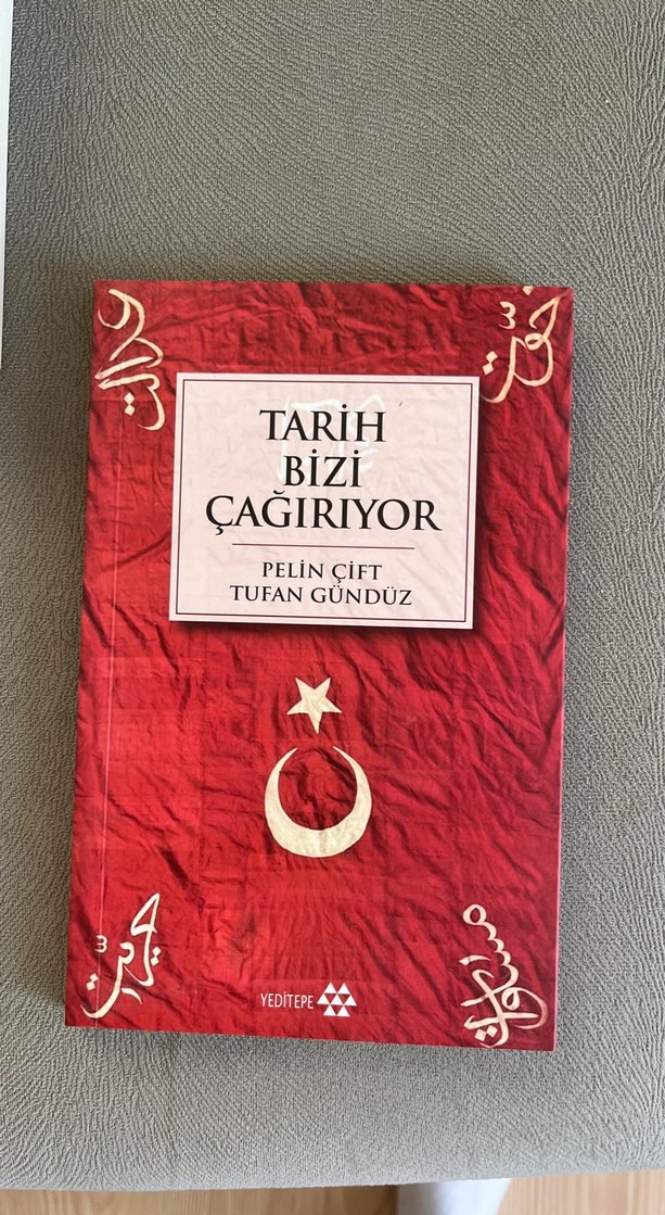 Pelin Çift ve Tufan Gündüz'ün "Tarih Bizi Çağırıyor" kitabı, kırmızı kapak, Osmanlı tarzı yazılar ve hilal yıldız simgesi içerir. Yeditepe yayınevi.