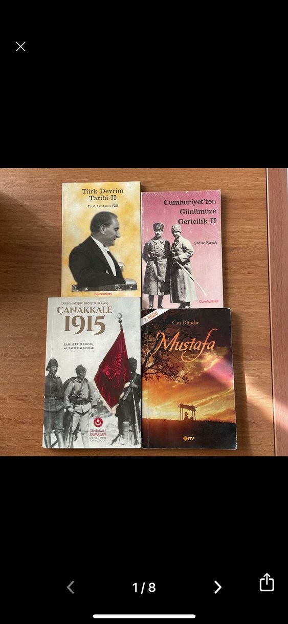 Dördünü birlikte satıyorum. Ayrı ayrı almak istiyorsanız yeni ilan açtırınız. Kitaplar iyi durumda sadece Mustafa kitabının arka sayfasında biraz yazılar yazılmış. Merak ettiklerinizi sormaktan çekinmeyin lütfen Çanakkale 1915 savaşı, Türk Devrimi tarihi ve Osmanlı'dan Cumhuriyet'e geçişi anlatan tarih kitapları seti.