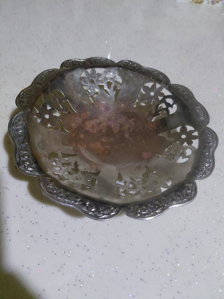 Gri ve bej tie-dye desenli, kesme çiçek motifli metal dekoratif tabak. Sofranıza nostaljik bir hava katar. ️