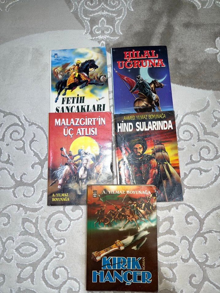 Tarihi ve macera temalı çocuk kitapları seti. "Fetih Sancakları", "Malazgirt'in Üç Atlısı", "Hilal Uğruna", "Hind Sularında" ve "Kırık Hançer" gibi kitaplar içerir.