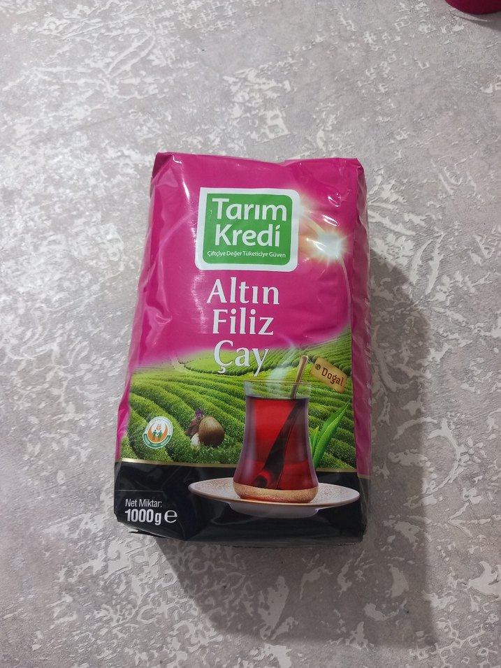 Tarım Kredi Altın Filiz siyah çay 1000g paketinde, koyu pembe canlı ambalajda sunulmaktadır. Doğal ve demlemeye hazır çaydır.