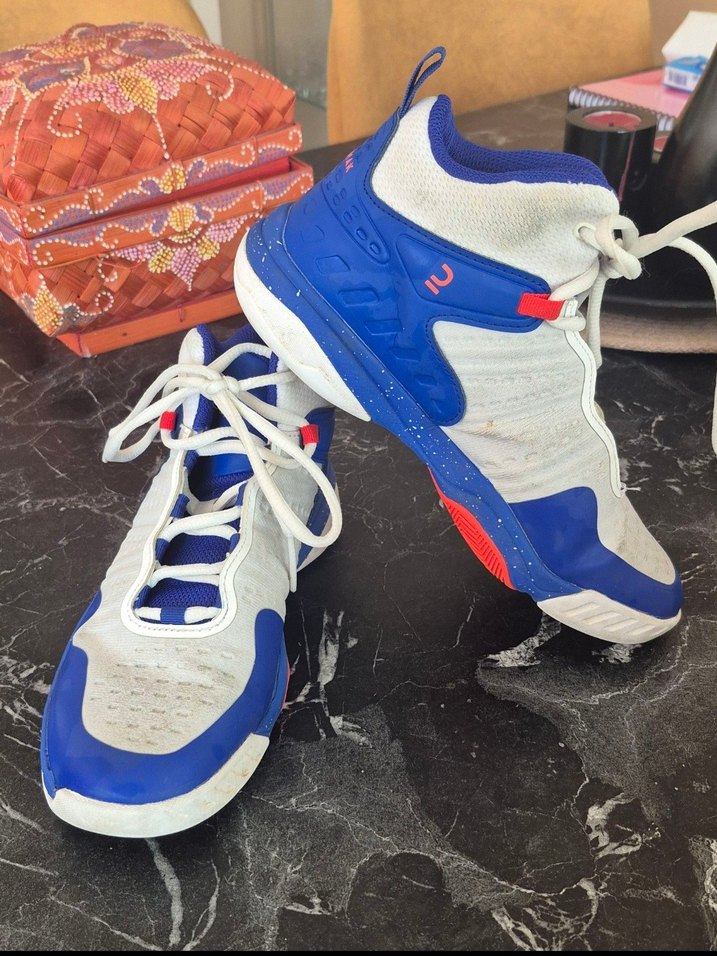 Mavi renkli basketbol ayakkabıları, kauçuk taban ve Velcro detaylarıyla spor ve sokak stilini bir araya getiriyor. Sadece salon antrenmanlarda kullanilmistir