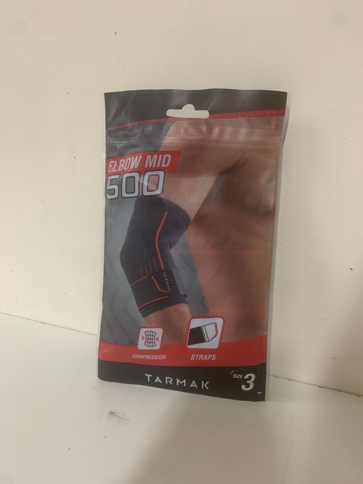 Tarmak siyah esnek bantlı, baskılı dirsek koruyucu, orta dirsek bölgesi için sıkıştırma ve destek sağlar. Beden 3. ️