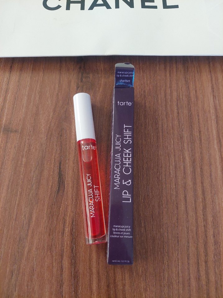 Parlak kırmızı renkte Tarte dudak parlatıcısı. Maracuja Juicy Lip & Cheek Shift, dudak ve yanaklarda kullanılabilir. Sherbet rengi.