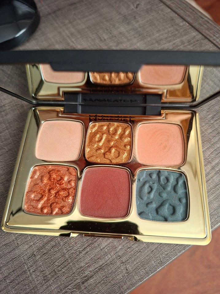 Sadece denedim.Altın kutuda, camel ve koyu tonlarda dokulu altı renkli göz farı paleti.