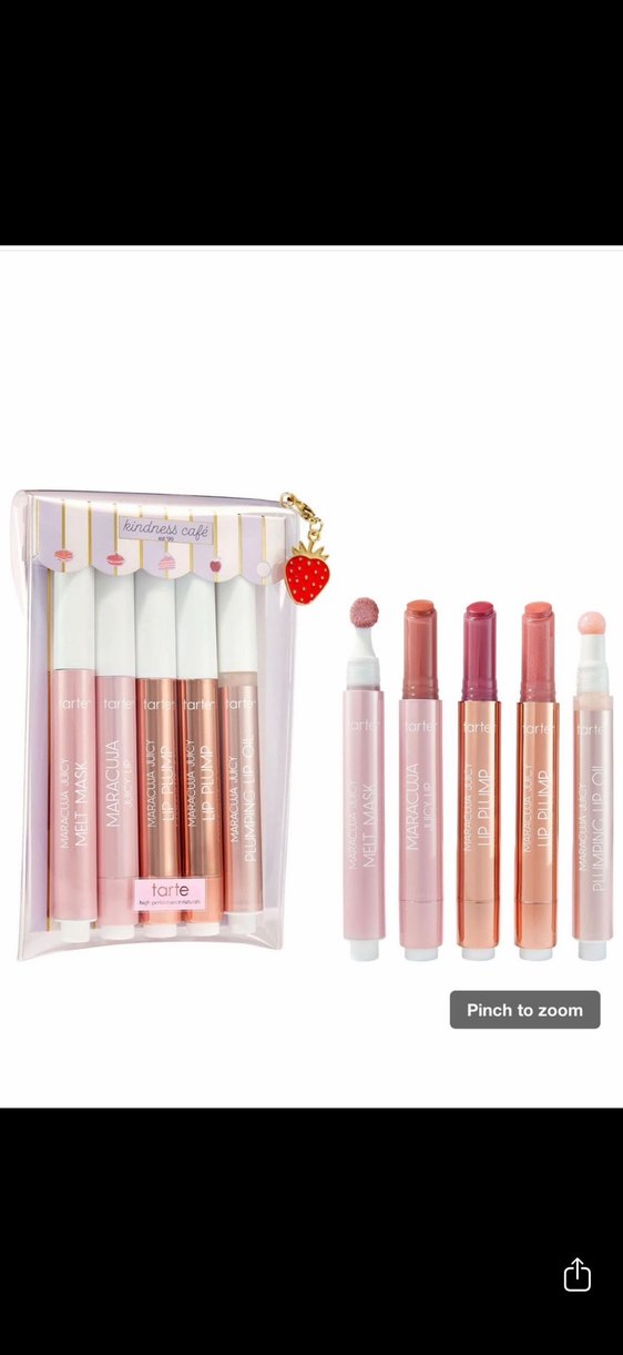 Tarte markasının pastel pembe tonlarında beş lip glossu, parlak ve yumuşak bir dokuya sahip. Şeffaf çantası ve çilek figürlü süsü ile birlikte.