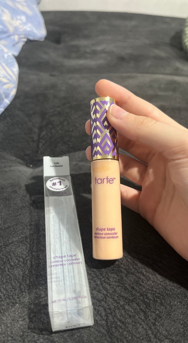 Tarte Shape Tape kapatıcı, pastel mor ambalajda yüksek kapatıcılık ve pürüzsüz uygulama sağlar. 12N fair neutral rengi buğday tenlere uygundur