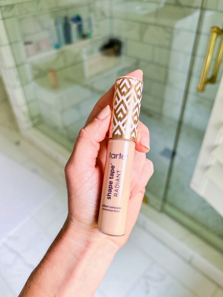 Tarte Shape Tape Radiant kapatıcı, açık bej renkte, pürüzsüz kapatıcılık ve parlak bir bitiş sunar. Altın desenli kapak detayına sahiptir. Cilt tonunu aydınlatır ve kapatır. ✨