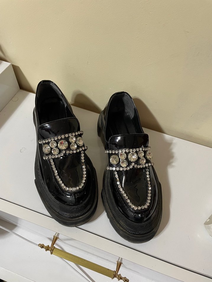 Kız çocukları için siyah, yılan desenli ve parlak taşlarla süslenmiş loafer ayakkabılar. Kauçuk malzemeden üretilmiş, gotik tarzda ve koyu renkte. Birkaç sefer kullandım tarz kızdan alındı çok şık bir ayakkabı üstünde sadece bir tane taşı eksik diye biliyorum bu şekildir 38 no