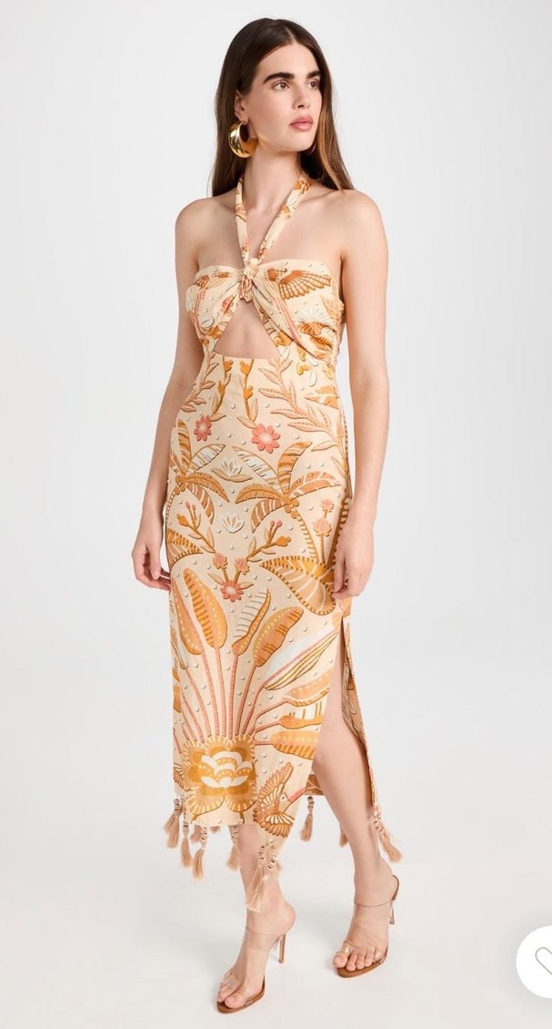Farm Rio'nun Jungle Chic Sand midi elbisesi, bükülmüş askılı yakası ve açık kesimli beliyle dikkat çekiyor. Soluk tonlardaki çiçeklerle süslenmiş bu bohem esintili tasarım, etek ucunda püsküller içeriyor. Boyun askılı Kolsuz Görünmez arka fermuar kapatma %55 keten %45 viskoz