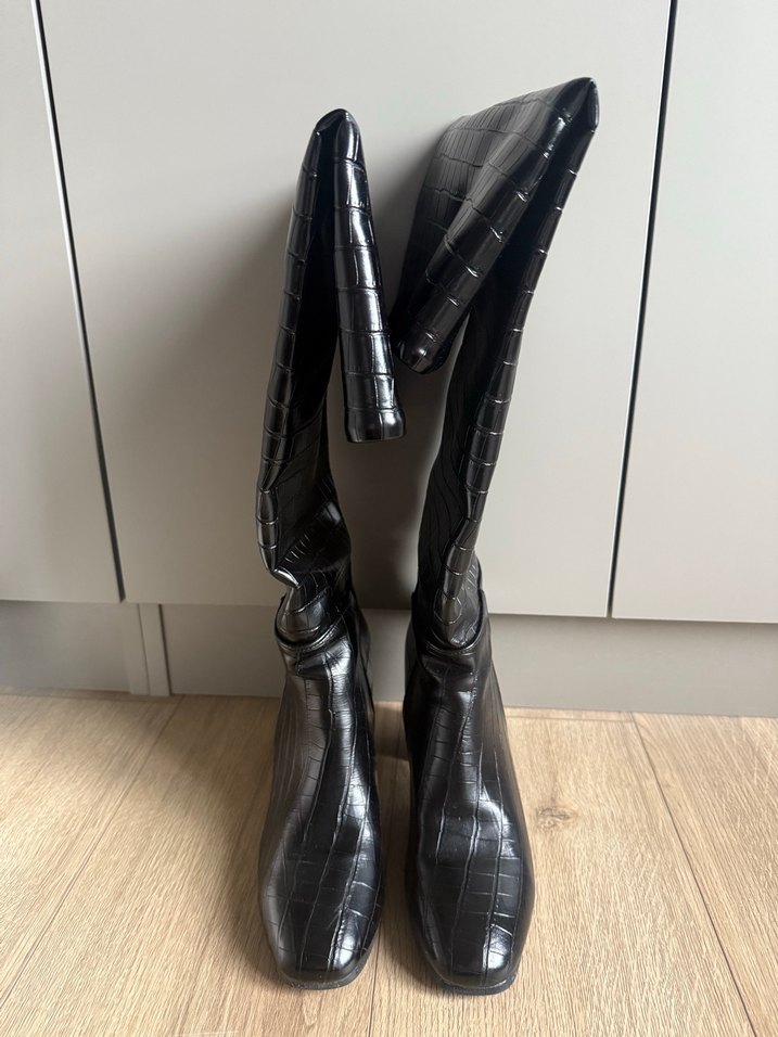 Bir kez kullanıldı, yenidir. 7 cm topuk, bilek önden arkaya 15 cm, baldır önden arkaya 21 cm, uzunluk yerden 59 cm, çok rahat ve yumuşak. #tarzkız #çizme