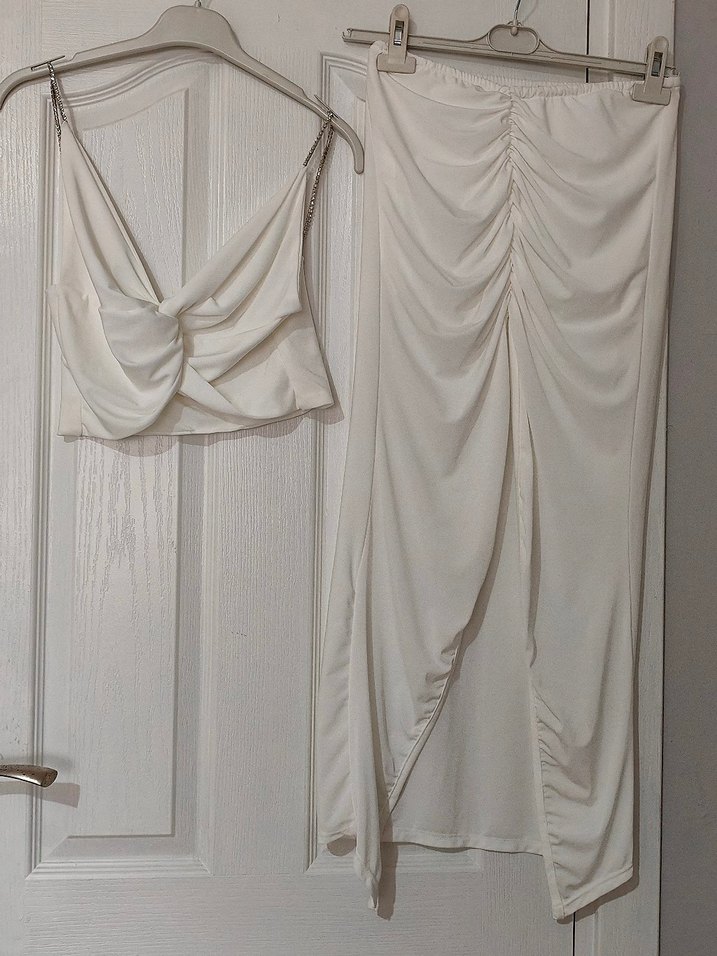 Taş askılı crop top ve büzgü detay astarlı etek. Hiç kullanılmadı. S/M bedene uygundur.