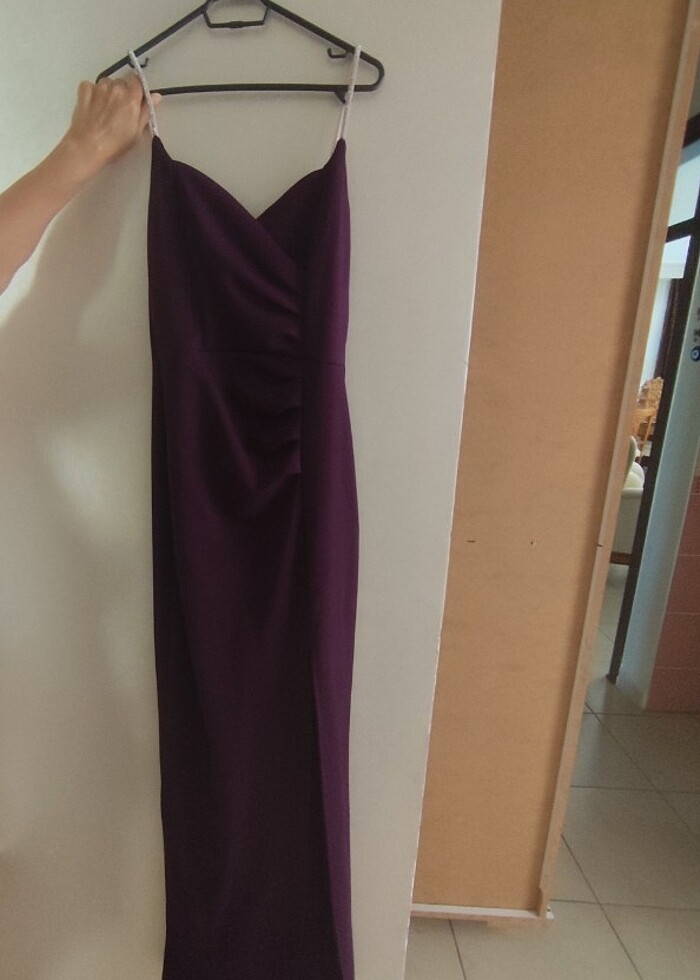 Sadece bir defa giyildi. Üstünde lekesi veya herhangi bir defosu yok. Elbise askılardan itibaren 155 cm ve M beden.