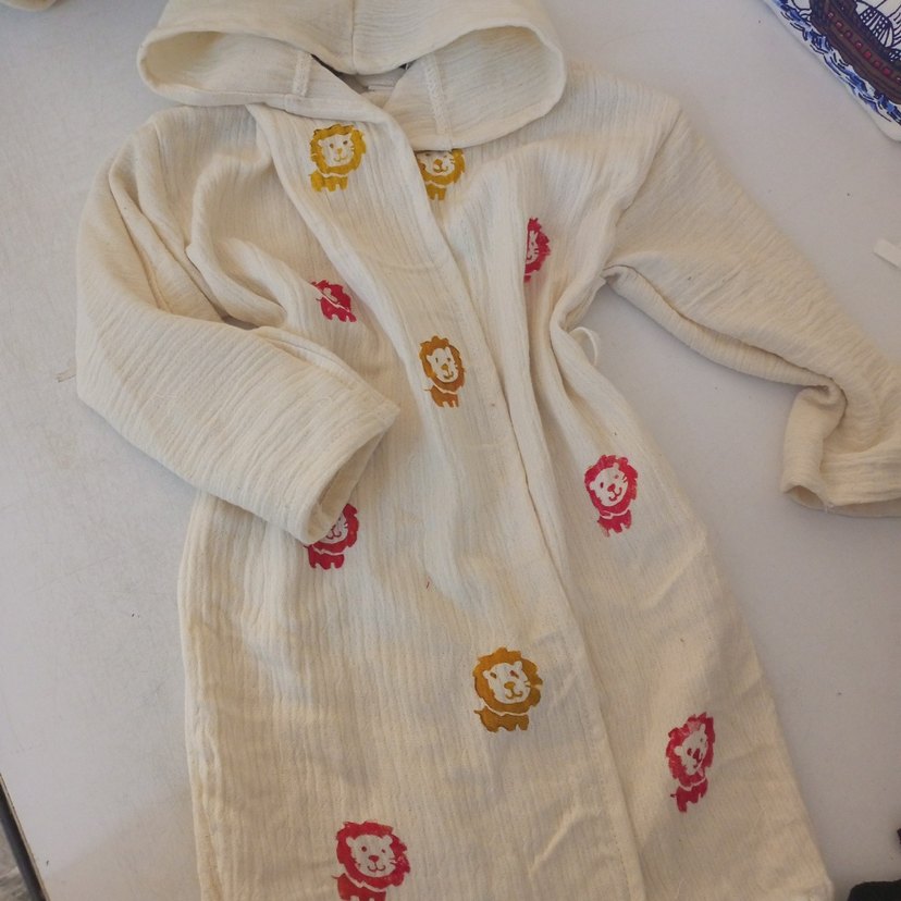 aslan desenli, kapüşonlu, erkek çocuk için açık beyaz muslin bornoz. Yumuşak ve rahat kumaştan yapılmıştır.
