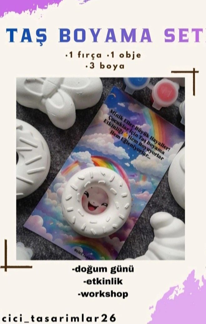 Taş boyama seti, 1 fırça, 1 obje ve 3 boya içerir. Doğum günü, etkinlik ve workshoplarda kullanılabilir.