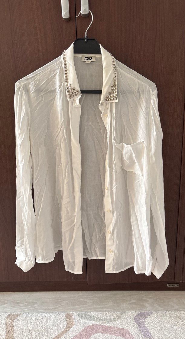 Taş detaylı yakası, uzun kollu ve düğmeli beyaz kadın gömleği. Hafif keten kumaştan, bol kesim ve günlük kullanıma uygun. ✨orjinal