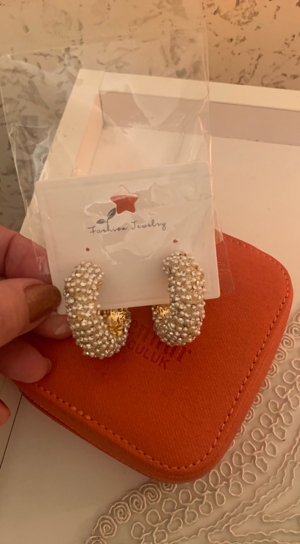 Taş detaylı ve parlak beyaz renkte olan bu küpe desenli ve klasik zarafet için düğünlerde kullanılabilir.