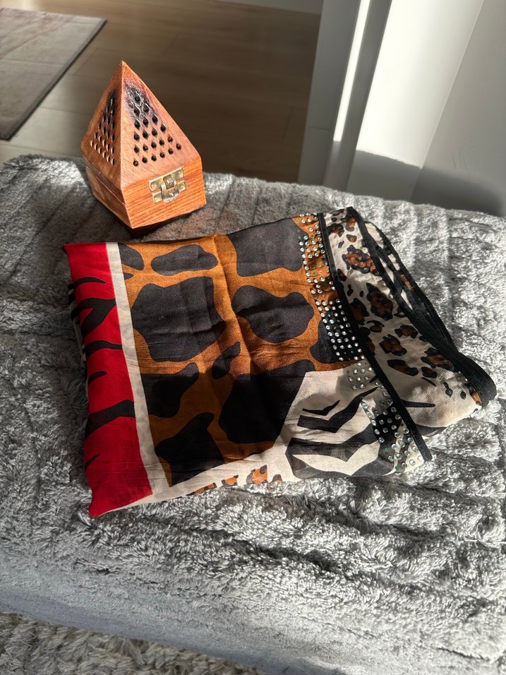 Kahverengi bohem kadın şal atkı, senteti kumaştan ve taş detaylıdır. Sıcak ve retro tarzları bir araya getirir, canlı koyu renk ve eklektik desenlere sahiptir.