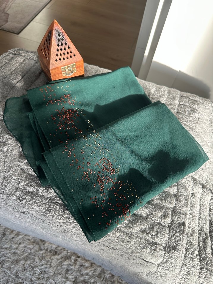 Kadınlar için şifonsu kumaştan, yeşil ışıltılı renkte ve zarif boncuk detaylı şal. Rahat, mütevazı ve bohem tarzı yansıtıyor.