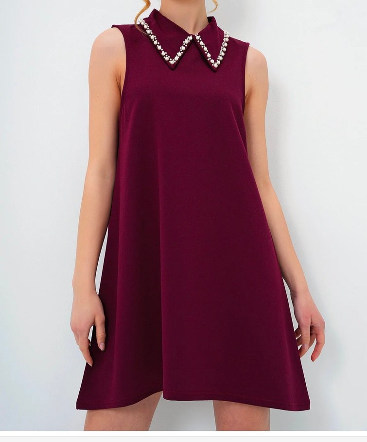 Taş detaylı yakasıyla bordo midi elbise, kolsuz ve bol kesimdir. Şık, parlak dokusuyla romantik akşamlar için uygundur.