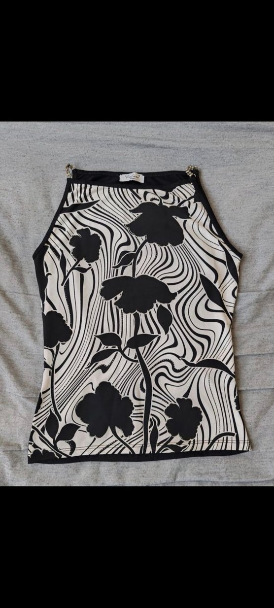 taş askılı , kayık yakalı, siyah-beyaz desenli, sentetik kumaştan kısa ve dar kesim mini atlet. Bohem tarz için uygun. y2k vintage volcano marka