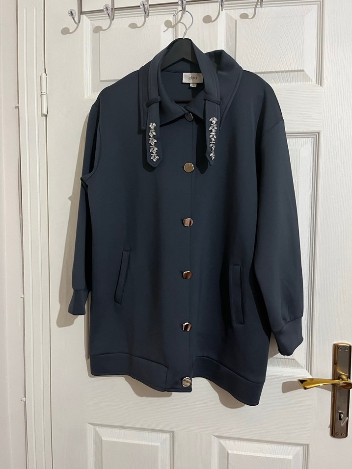 Rahat kesim taş detaylı scuba hırka/ceket. Taş detaylı yaka çıkabiliyor. Düz de kullanabilirsiniz.Sayılı giyildi. Ekru marka 3 beden / 44 46 bedene olur.