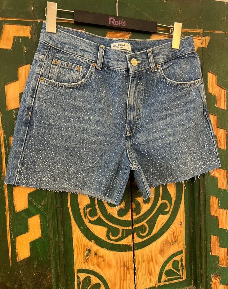 Payet detaylı, bol kesim koyu mavi kot şort. Mini boyda, sokak stiline uygun, günlük kullanıma uygun.