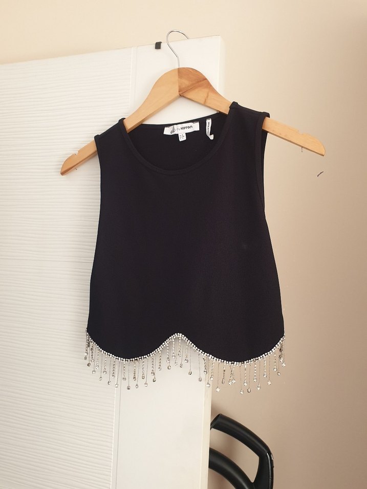 Siyah, kolsuz, kısa ve vücuda oturan crop top. Üst kısmı yuvarlak yaka ve boncuklu püskül detaylarıyla dikkat çeker.✨