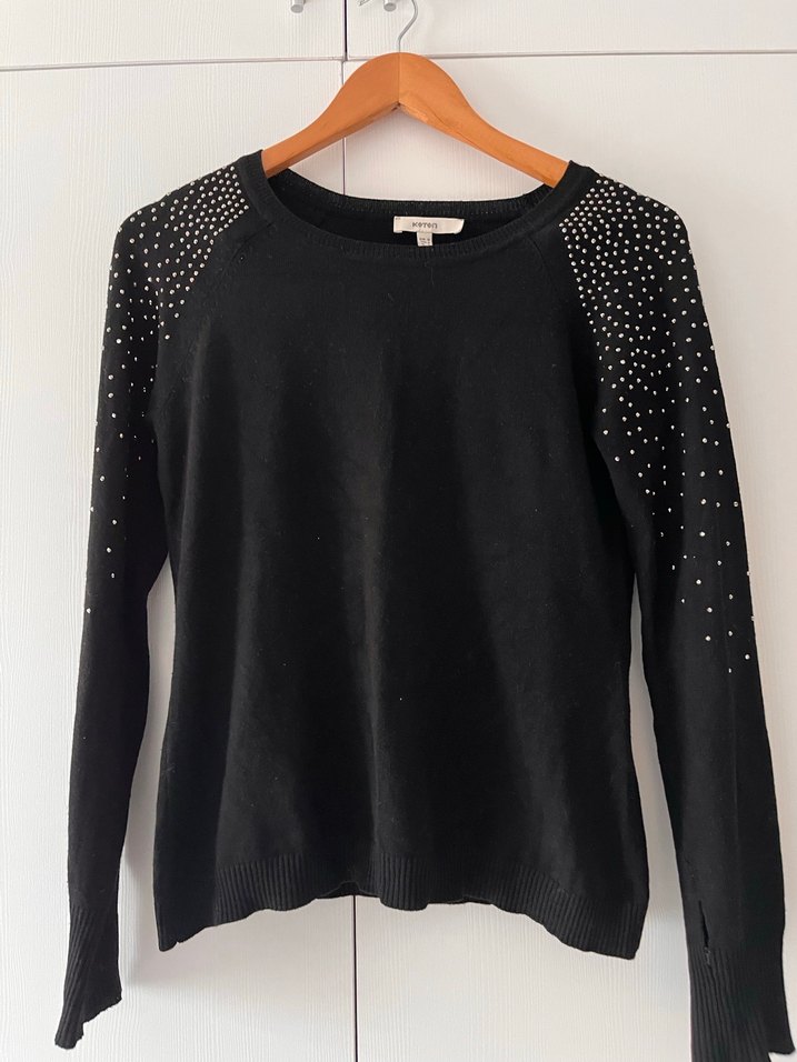 Taş detaylı omuzlarıyla uzun kollu, siyah ve fitted kesim triko kazak. Minimalist goth tarzında, günlük kullanıma uygun.