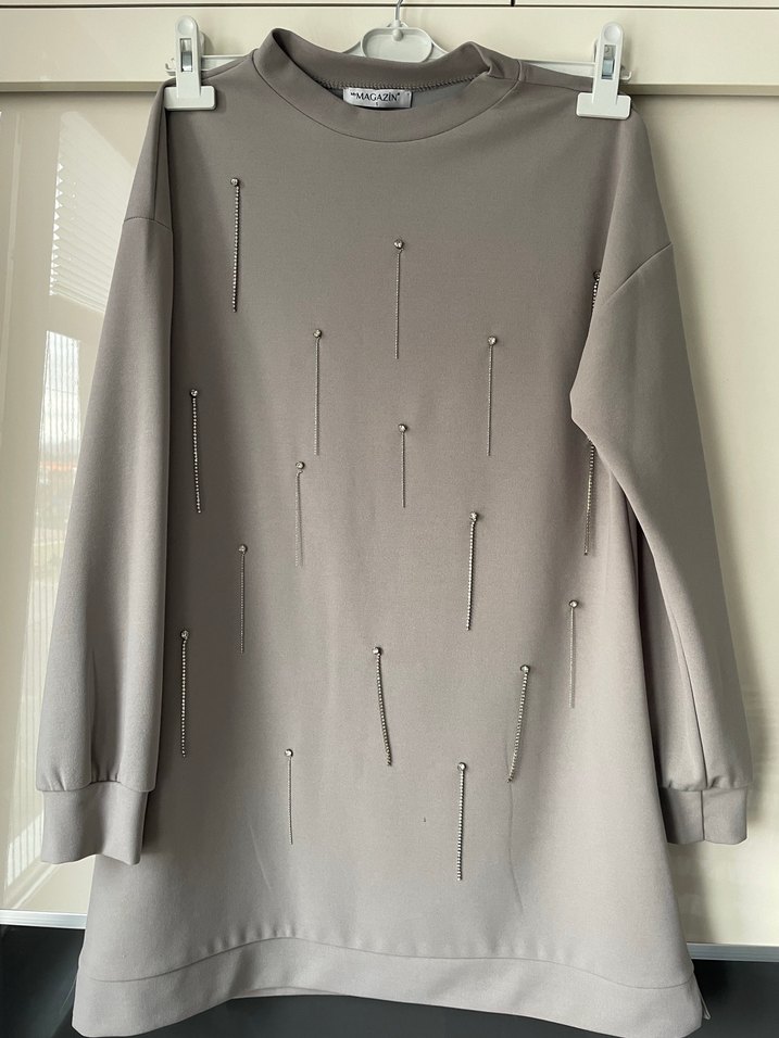 Krep kumaştan, taş detaylı ve işlemeli desenli, uzun kollu, düz kesim gri tunik. Rahat ve günlük kullanıma uygun. Hiç giymedim. Çok uyguna koyuyorum ihtiyacı olan alsın güzel bir takım 38-40 beden uyumlu