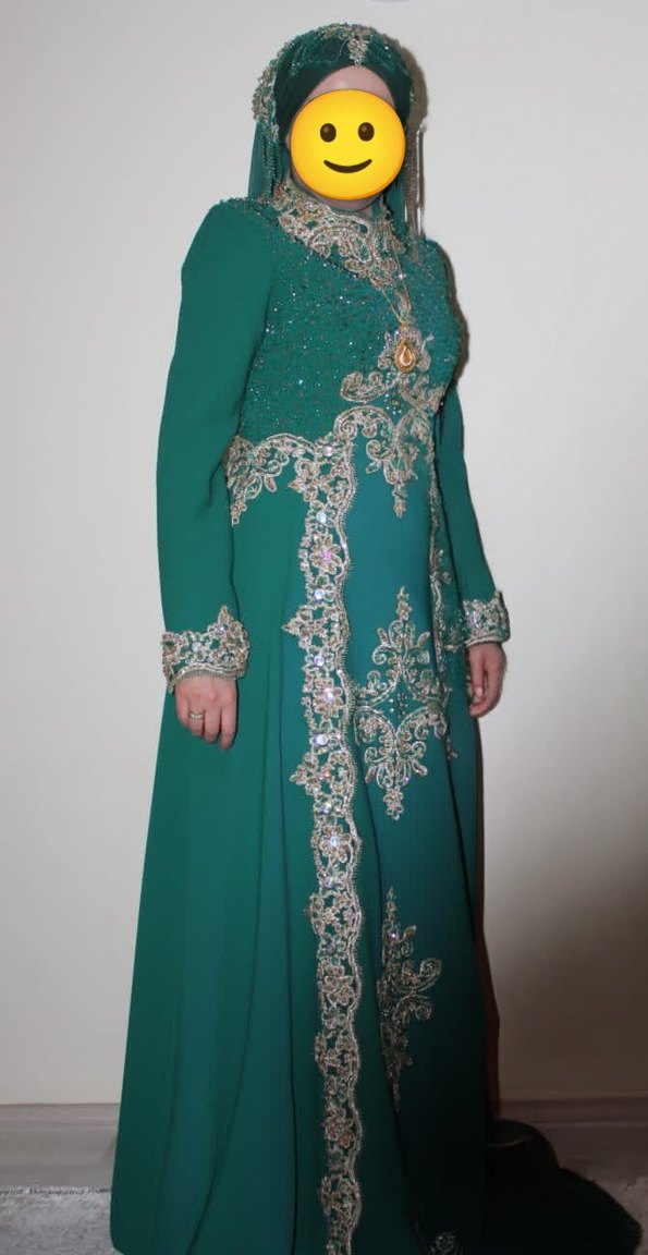 yeşil bindallı taş detaylı uzun duvaklı. sadece 1 defa giyildi hiç bir sorunu yok.