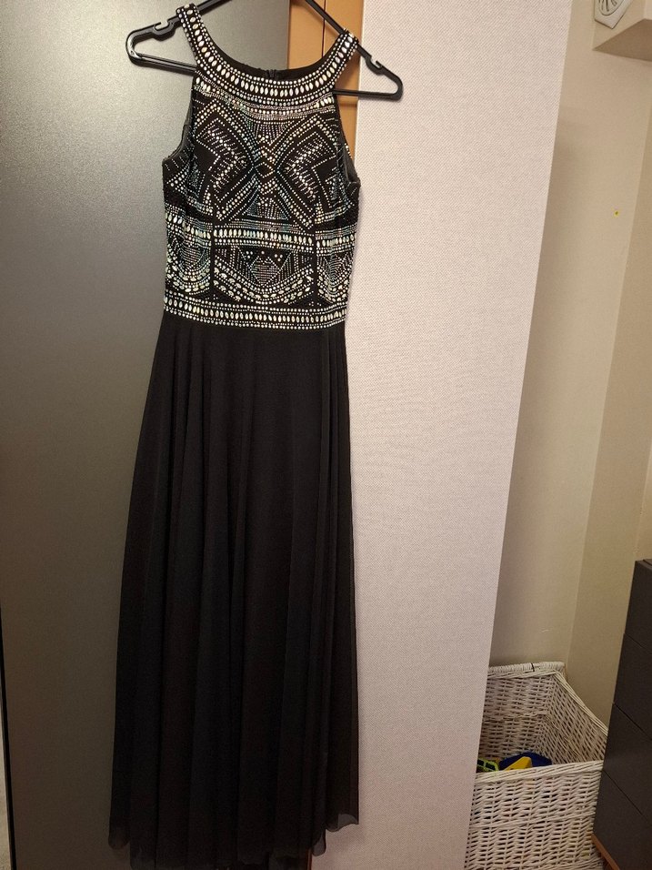 38 beden uyumlu bir kez kullanıldı ölçü detayları görsellerde mevcut kuru temizlemesi de yapılmıştır Boncuk işlemeli, nakışlı desenlere sahip, yüksek yakalı ve kolsuz siyah uzun bohem elbise, düğünler için uygun.