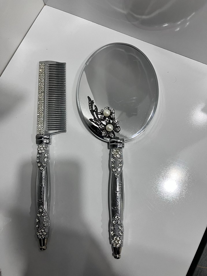 Taş işlemeli saplara ve inci detaylara sahip aynalı tarak seti, şıklığı ve işlevselliği bir arada sunar. Hiç kullanılmamıştır