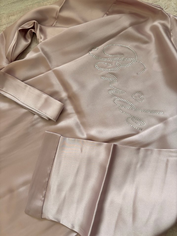 Pudra renkli, uzun ve taş işlemeli Bride sabahlığı. Parlak yüzeyli ve uzun kollu, günlük uyumlu şık bir tasarım. ✨