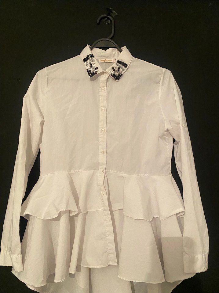 Düğmeli, yakasında siyah ve şeffaf boncuk işlemeleri olan beyaz, uzun kollu, kumaş kadın gömleği. Günlük kullanıma uygundur.